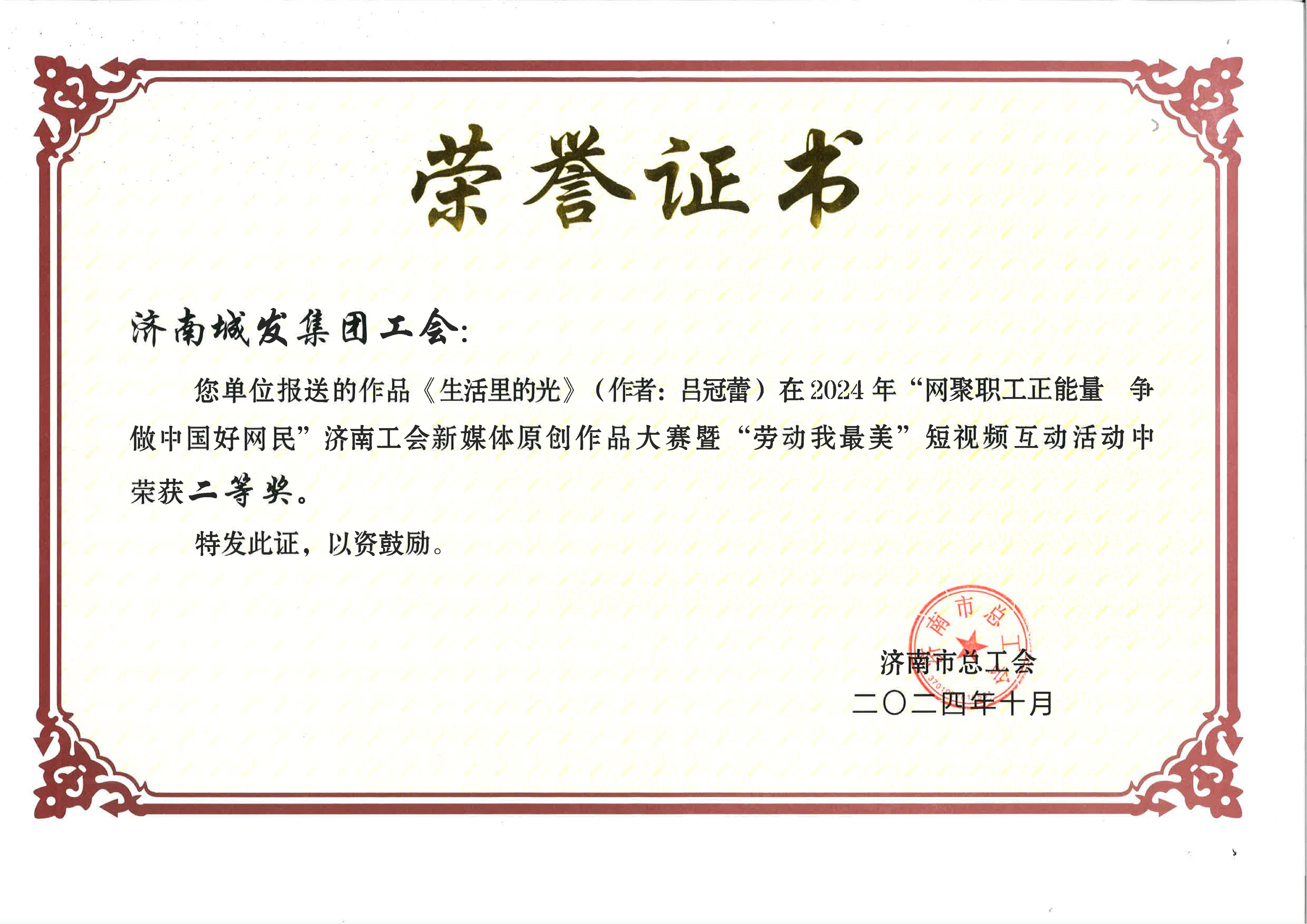 城發(fā)集團榮獲濟南工會新媒體大賽“勞動我最美”短視頻互動活動二等獎